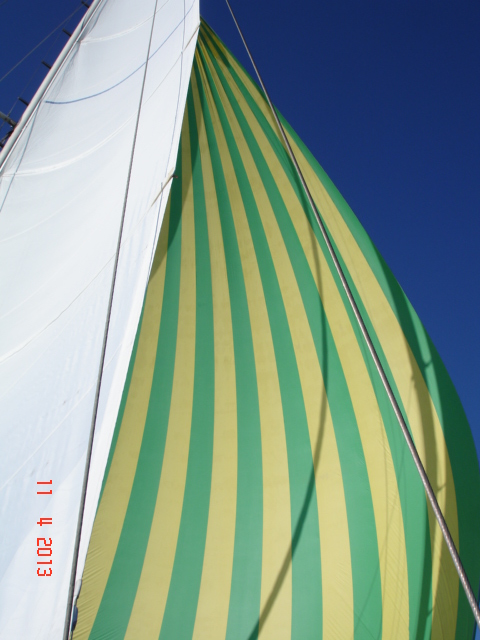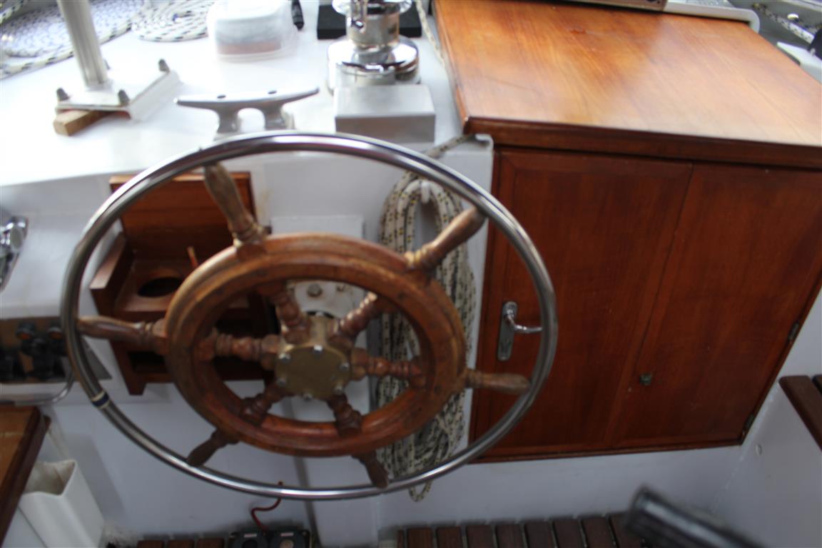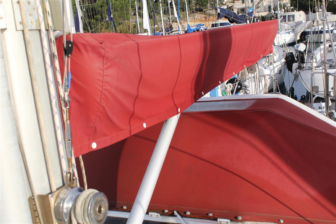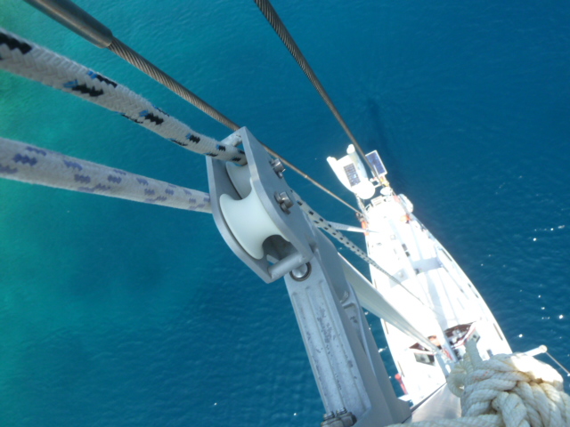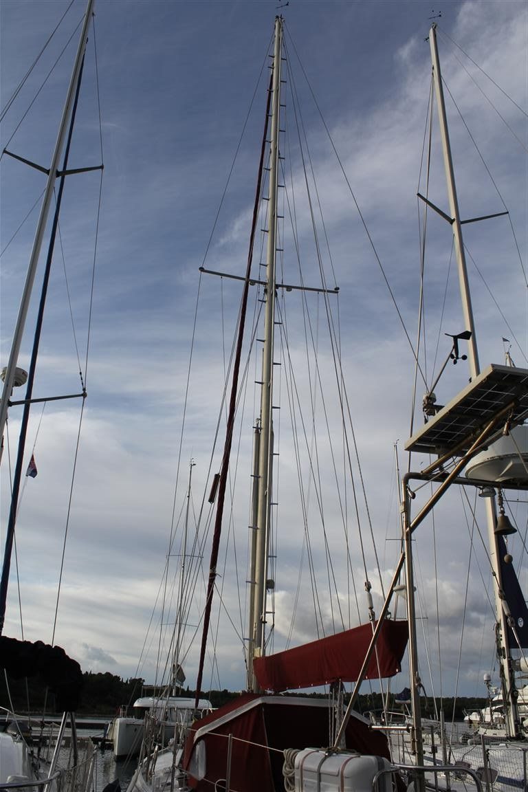Der 19m hohe Mast ist über fest montierte Tritte sehr einfach zu besteigen. Im Masttop ist eine LED als Ankerlicht montiert. Die Profurl Rollanlage des Baumes erlaubt ein stufenloses Reffen des Großsegels. Die Roll-Genua ist am Masttop angeschlagen. Das Kutterstag ist für eine Arbeits-, oder Sturmfock als Selbstwendefock auf ca. 14m angeschlagen. Die Arbeitsfock kann man ab ca. 5 Bft. segeln. Da geht sie bei der Wende von selbst durch den Wind. Mit der gerefften Genua ist ein lockeres Segeln bis 7 Bft. bei 8-9 kn möglich. Der Segelsack für den Blister wird in der Decksluke der Vorschiffskabine eingehängt und von dort aus gesetzt.
