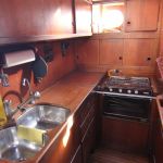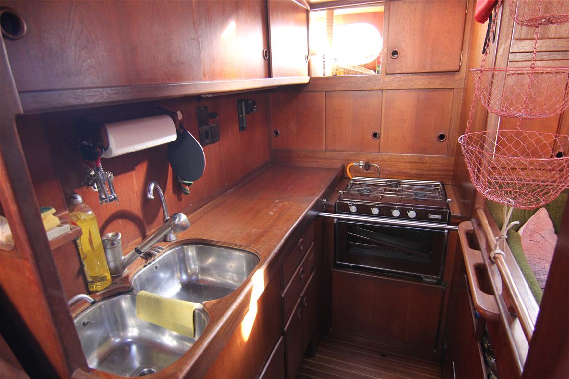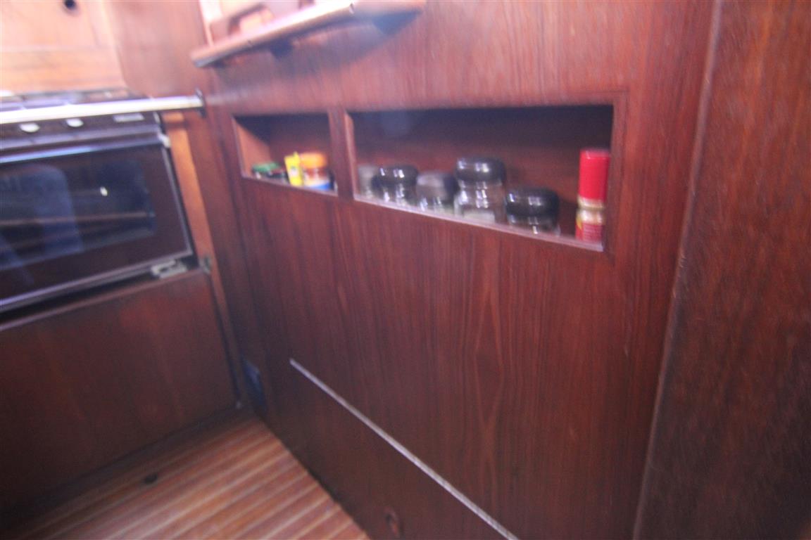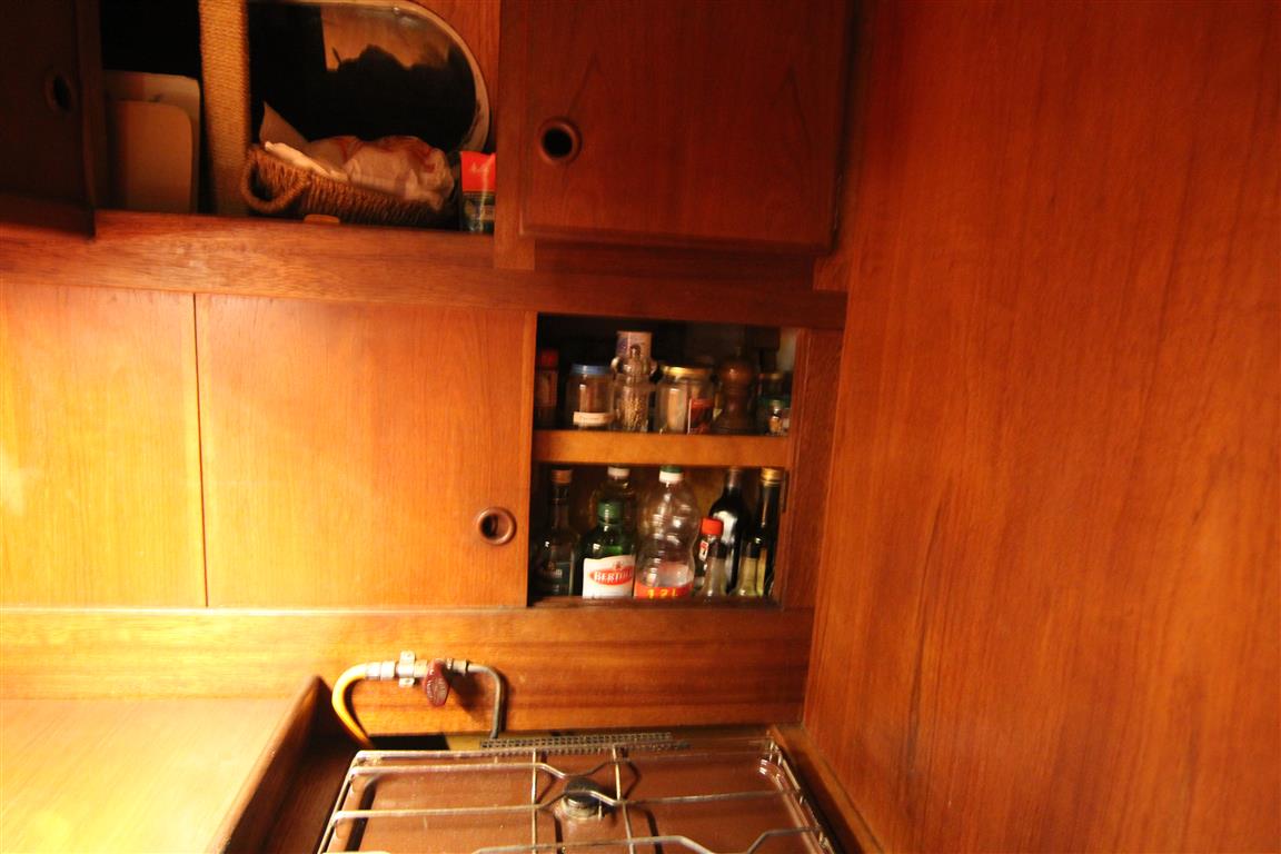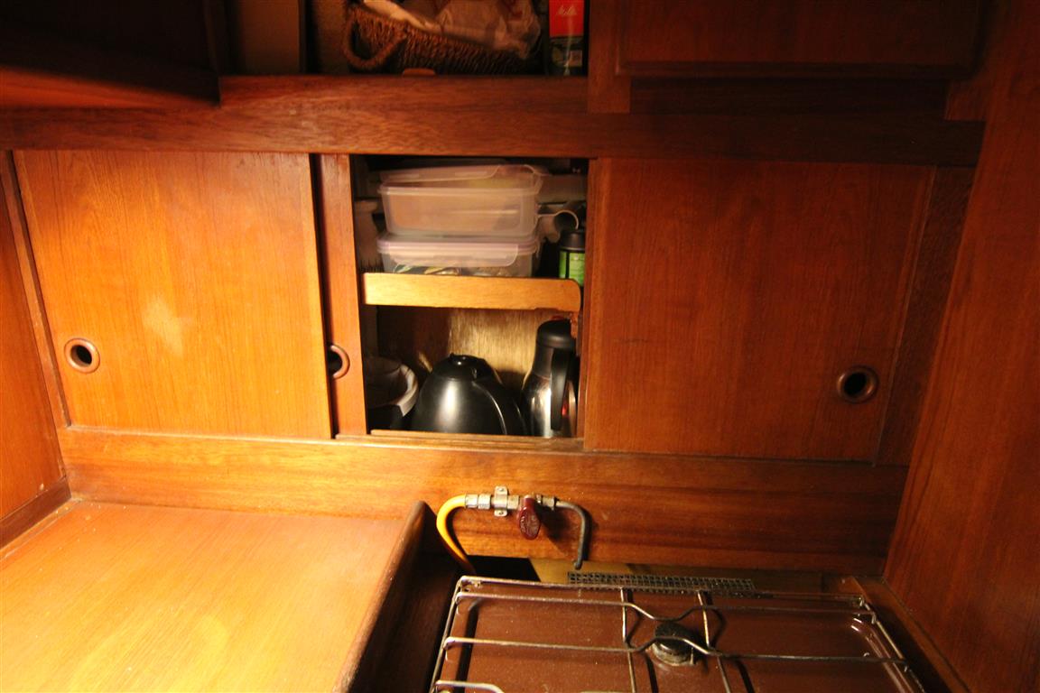 Geschirr, Besteck etc. befinden sich in 2 Schubladen und zahlreichen Schapps. Töpfe und Pfannen liegen unter einer Sitzbank im Salon. Zugriff hat man entweder unter dem Polster der Bank oder über eine breite Klappe von der Pantry aus .
