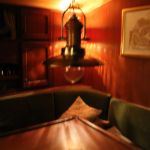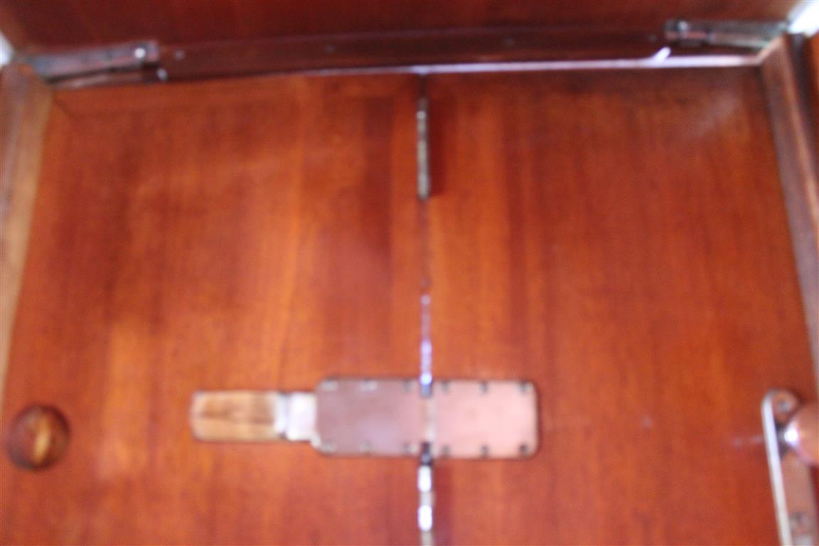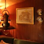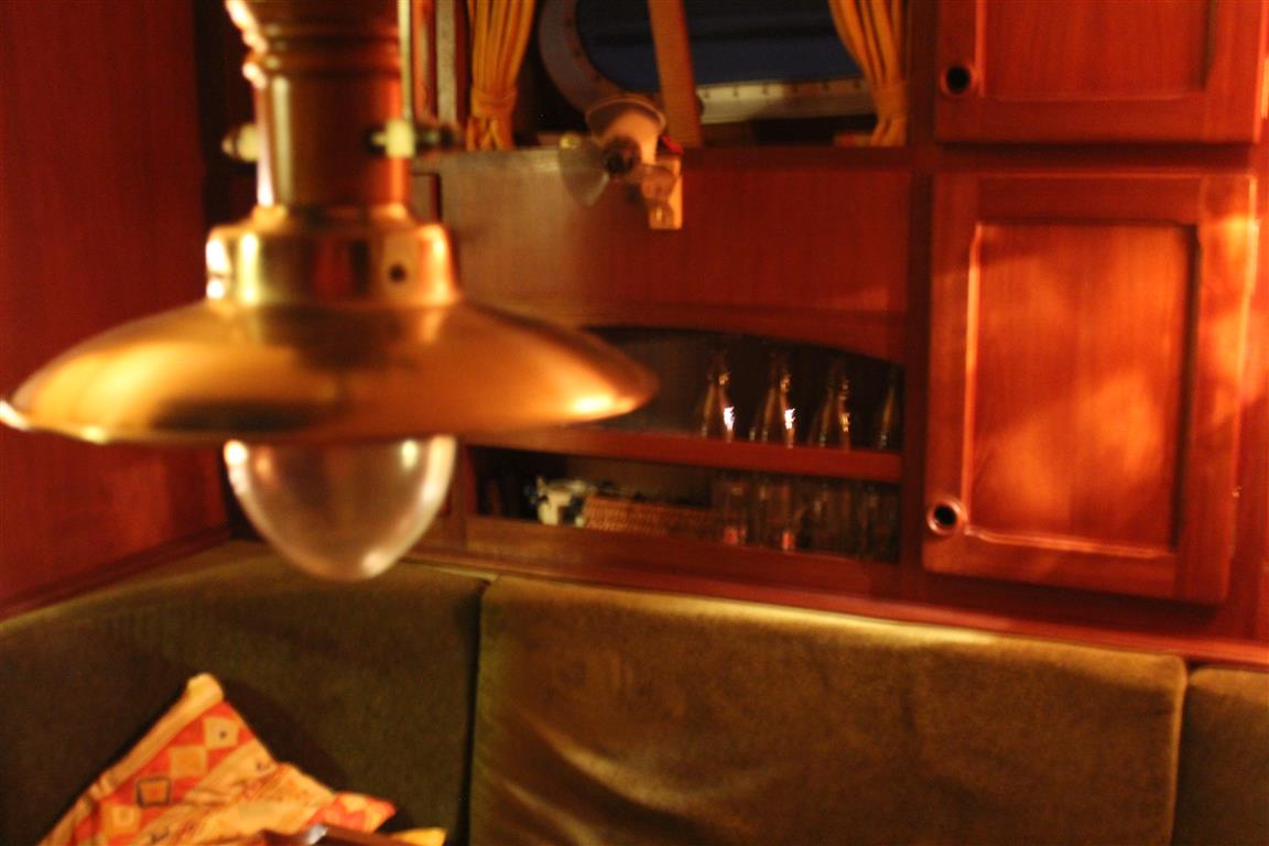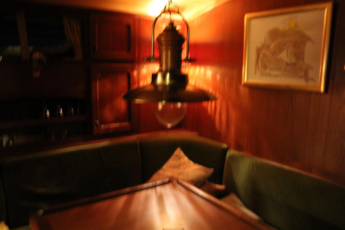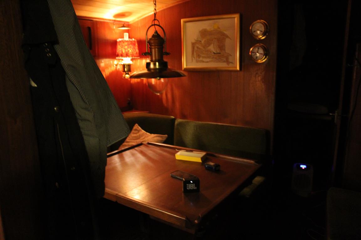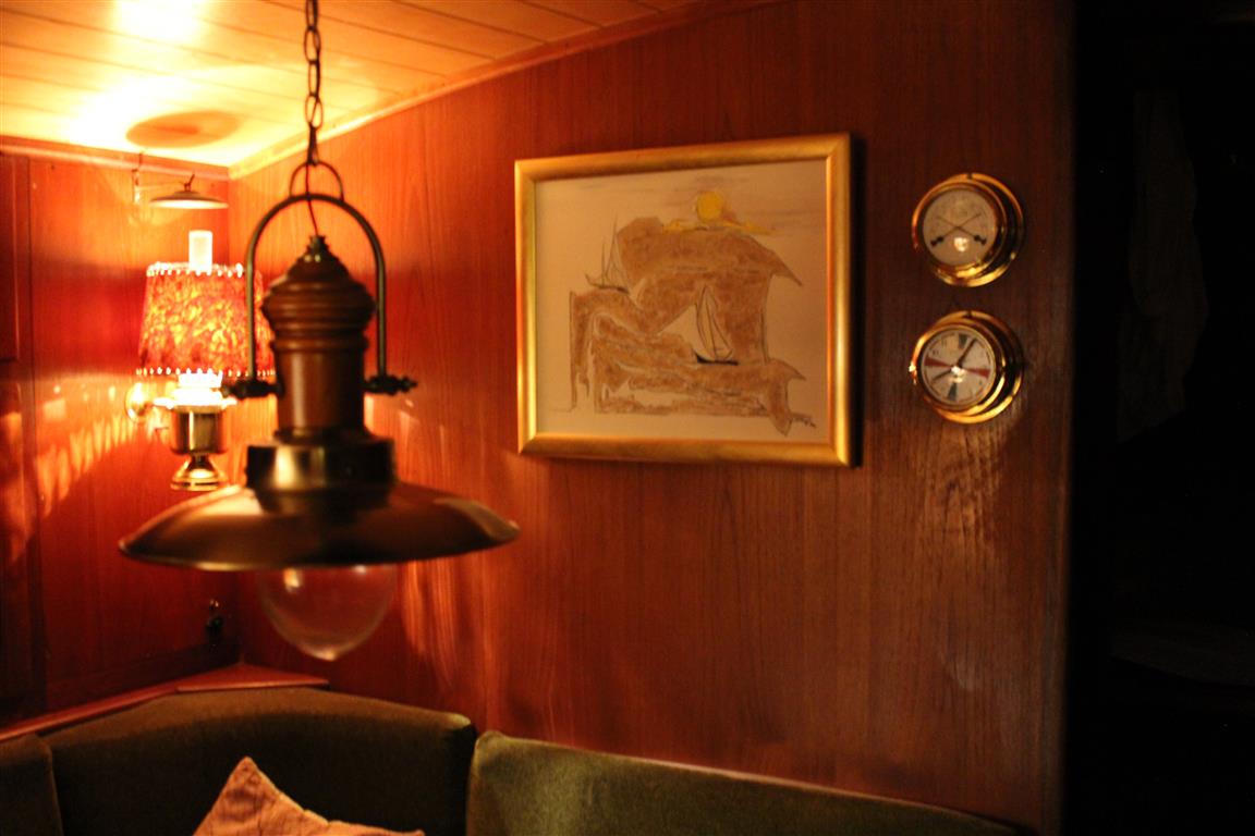 Der Niedergang ist mit einer massiven Holztür und einer Schiebeplatte verschlossen. In der Decke sind 2 Leuchten montiert; eine Hänge- und Wandlampe sorgen zusätzlich für ausreichend Licht.
