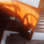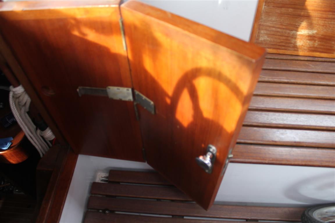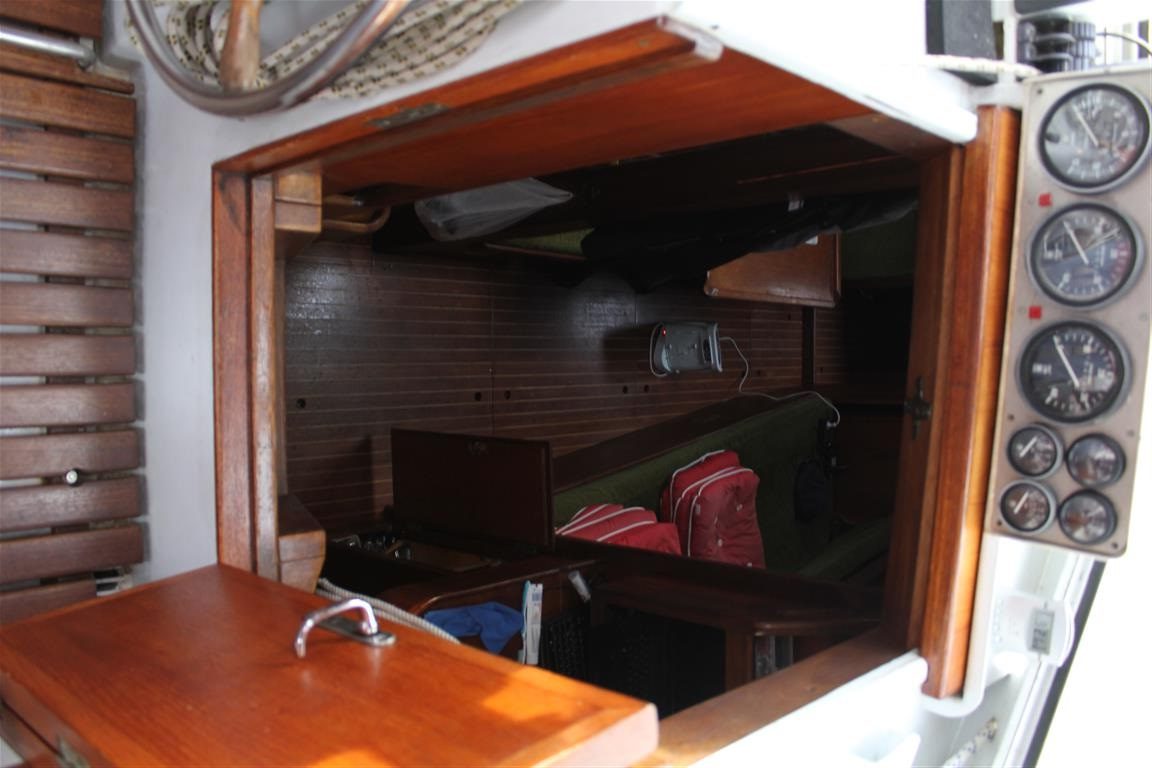 Die Uhr und der Barometer sind von Wempe. Die große Luke im Deck ist, wie alle großen Luken, stufenlos in beide Richtungen zu öffnen. Unter beiden seitlichen Luken ist reichlich Stauraum. Stauraum ist unter allen Sitzbänken, ebenso an der Backbordseite hinter dem Rückenpolster.