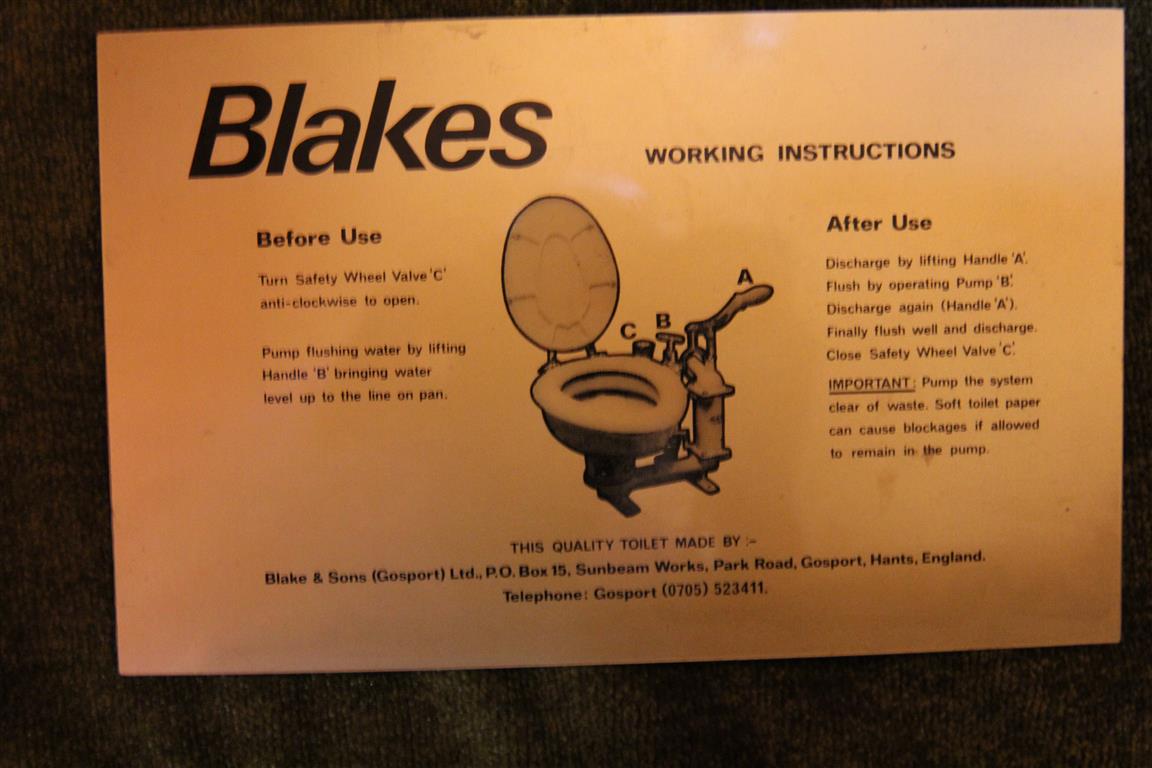 Man darf sagen, dass die Blake ein Higlight auf dem Schiff ist. Diese Schiffstoiletten werden seit Jahrzehnten gebaut und in gleicher Form verkauft. Die Werbung und das Handbuch der Toilette zeigen einen Taucher, der aus einem versunkenem Schiff die Blake heraufholt. Titel: und sie funktioniert immer noch.